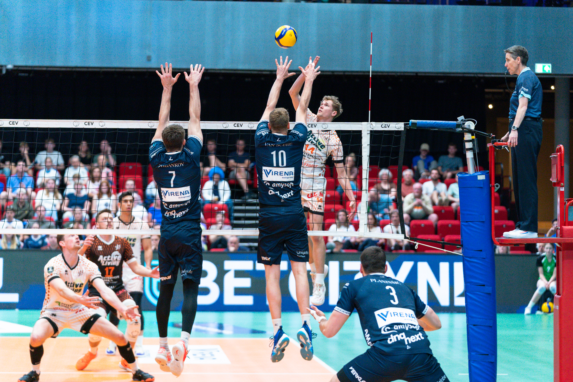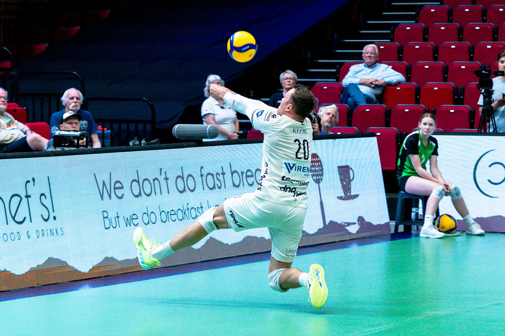 Vanaf het begin was Lycurgus goed bij de les en liet zien dat het vanmiddag moest gebeuren. Er was scherpte en overtuiging. Maar dat gold ook voor de gasten die in het eerste deel van de set steeds ee puntje voorsprong hadden en zelfs even wegliepen naar 13-10. Maar mede door Van Schie en Boekhoudt werd het 13-13. Niet veel later blokte Zhbankov Lycurgus voor het eerst naar een voorsprong; 17-16. Toen Parraguirre 21-19 noteerde leek eerste setwinst in de maak, maar zover kwam het niet. Een challenge die verkeerd uitpakte en een sterke Maksim Shkredau werd Lycurgus te machtig. Met 25-23 verlies van de set als resultaat.