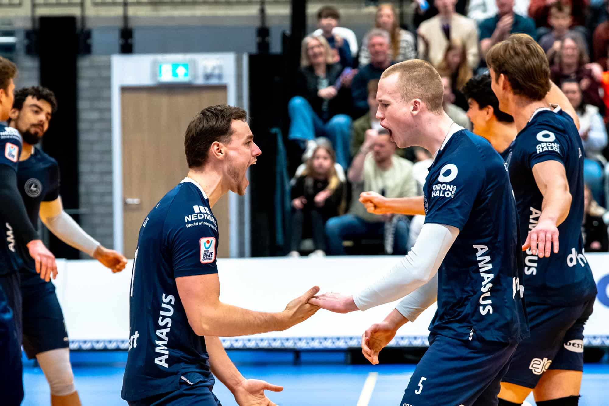 Coach Gortzak zijn stemming was na afloop dan ook opperbest. ‘Het was een fantastische middag. In de eerste set speelden we al goed, maar lieten we een paar kansjes liggen. Vanaf set twee was het duidelijk in het voordeel van ons. Deze hoort zeker tot de top drie beste wedstrijden van het seizoen.’