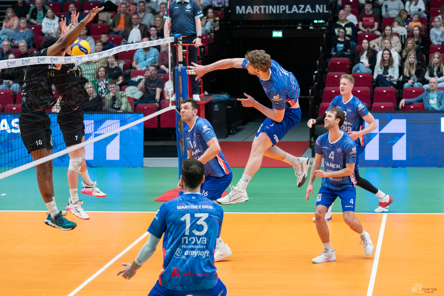 Een gevoelige tik voor de gasten, maar ze waren nog niet verslagen en bleven alles geven. Nova Tech Lycurgus hield moeite en moest hard voor de punten blijven werken. De slotfase van set drie bracht het volgende cruciale hoofdstuk van de wedstrijd. Deze keer stond Nova Tech Lycurgus met 19-15 achter, waarna de steeds beter spelende Martinez Gion een hoofdrol voor zich opeiste. Door op 17-19 twee onvervalste aces te produceren. Daardoor ging de stand naar 19-19 en via 20-20 naar 22-22. Daarna sloeg Nova Tech Lycurgus met drie punten op rij genadeloos toe. Boekhoudt na een rally, Martinez en een killblock van de aan het eind van de eerste set al ingevallen Cole Bogner waren de makers.
