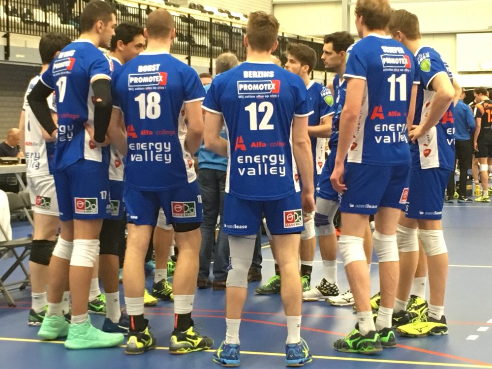 Bij de volle winst in Abiant Lycurgus weer koploper. Nu staat de landskampioen nog tweede met 47 punten uit 17 duels. Coach Arjan Taaij had ervoor gekozen om Sam Gortzak het spel te laten verdelen. Stijn van Schie was de diagonaal. Verder stonden Bryan Fraser, Mikelis Berzins, Sander Scheper, Dennis Borst en Just Dronkers in de basis. De eerste set ging tot 16-15 gelijk op. Fraser sloeg 21-16 binnen en Berzins tekende voor 24-17. Vervolgens duurde het nog drie punten voordat Scheper met een tikje door het midden de eerste set beëindigde .