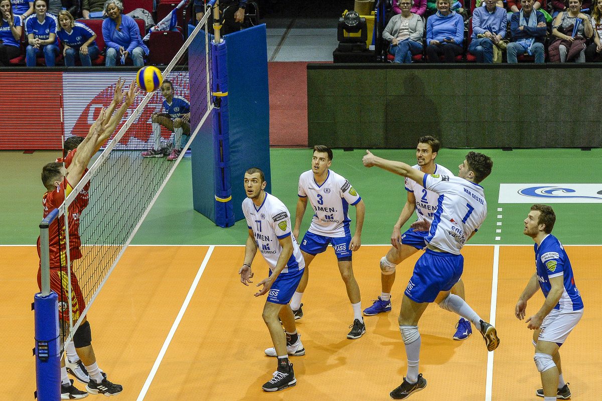 In een met 1.300 toeschouwers gevuld MartiniPlaza was de eerste set misschien wel beslissend. Het was er eentje om in te lijsten. De ploeg van coach Arjan Taaij speelde met zoveel overtuiging en energie dat Dynamo er totaal niet aan te pas kwam en volledig onder de voet gelopen werd. Niels de Vries blokkeerde bij 10-4 twee keer op rij een aanval af, waardoor het 12-4 werd. De toon was gezet. Er kwam amper tegenstand van de gasten. Wytze Kooistra was vanaf de eerste bal hot en kon heerlijk tekeer gaan. De bluearmy denderde door. De Vries zette zijn handtekening onder deze geweldig goede set door de laatste twee punten voor zijn rekening te nemen met een snelle middenaanval en een blok. Het werd 25-11 en liet aan duidelijkheid niets te wensen over.