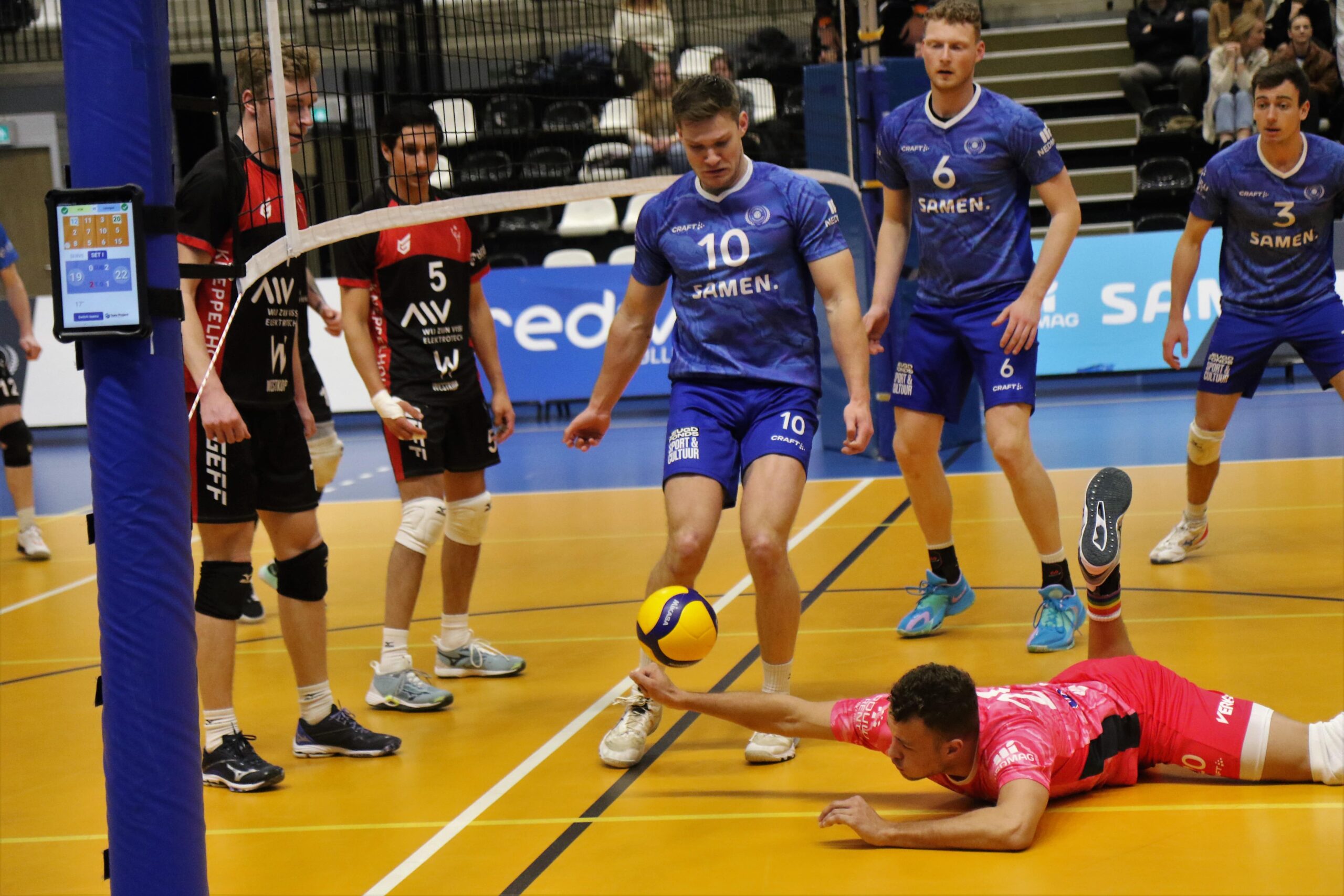 Het laatste punt van de eerste set was discutabel, omdat het onduidelijk was wie de antenne raakte. Volgens de lijnrechter kwam dat door een aanvallende bal van VCN. Waar de gasten het niet mee eens waren. In het wisselen van kant gebruikte coach Ferry van Hal onwelvoeglijk taalgebruik in de richting van de technische staf van Lycurgus. Dit kwam Van Hal op een rode kaart te staan, waardoor Samen Lycurgus met een 1-0 voorsprong aan de tweede set begon.