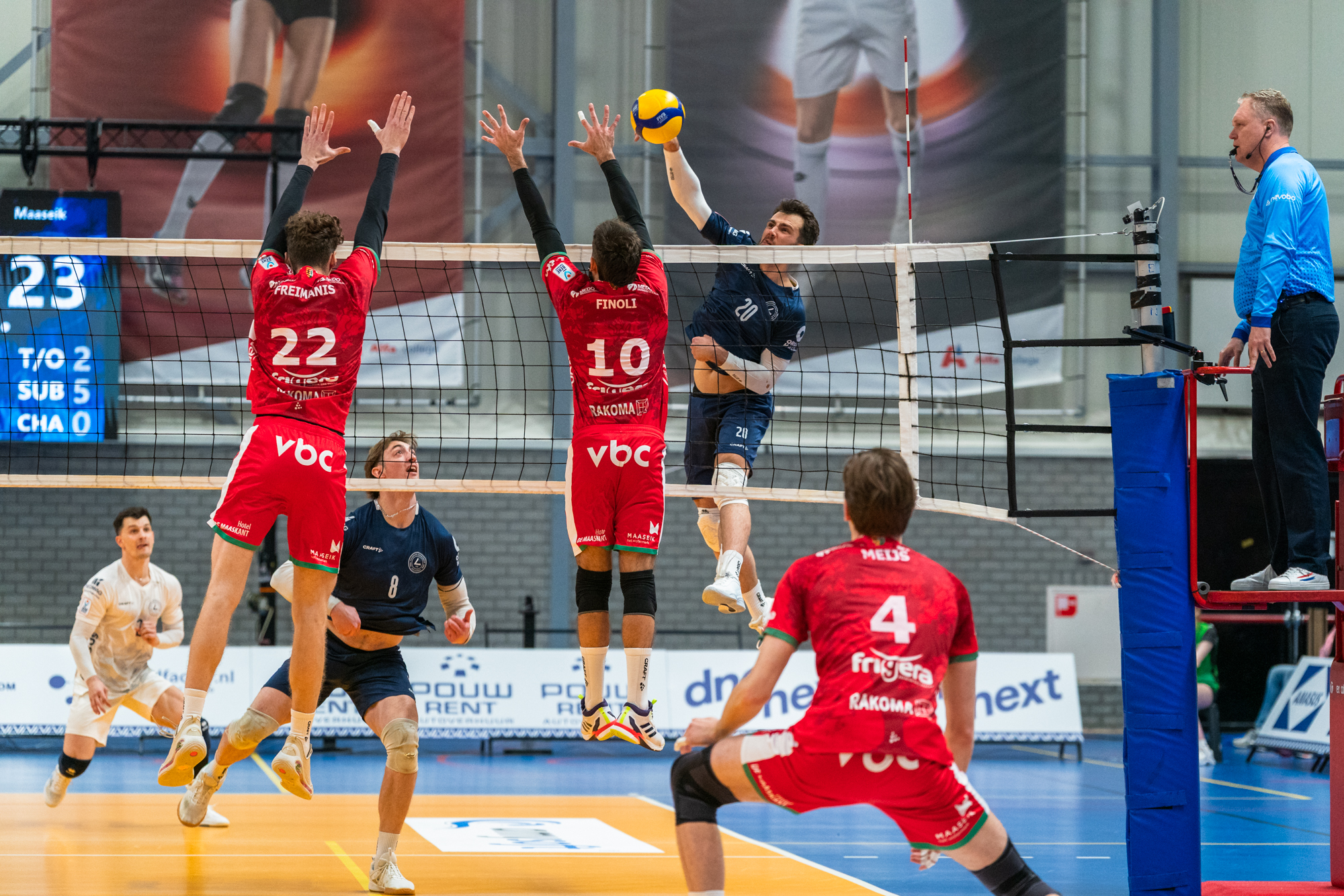 In de eerste set ging het tot 4-4 gelijk op, daarna sloeg Maaseik een gaatje naar 7-11. Dit verschil bleef lange tijd in stand en bleek uit niets dat de gasten minder scherp waren nadat ze zich woensdagavond geplaats hadden voor de halve finale van de CEV-Cup. In de eerste set bleek al dat het serverend lastig bleek. Niet altijd vanwege een ace, maar door de hoge algemene servedruk. Daardoor kwam de passing bij Lycurgus onder druk te staan. Toen een ace van Pierre Perin de stand naar 15-20 tilde leek sprake van een vroegtijdige beslissing, maar via een slimme bal van Collard, een ace van Van Solkema en een score van Brilhuis kwam de thuisclub terug tot 18-20. Daarna lukte een volledige terugkeer in de set net niet en was het Meijs die het benutte setpunt voor zijn rekening nam.
