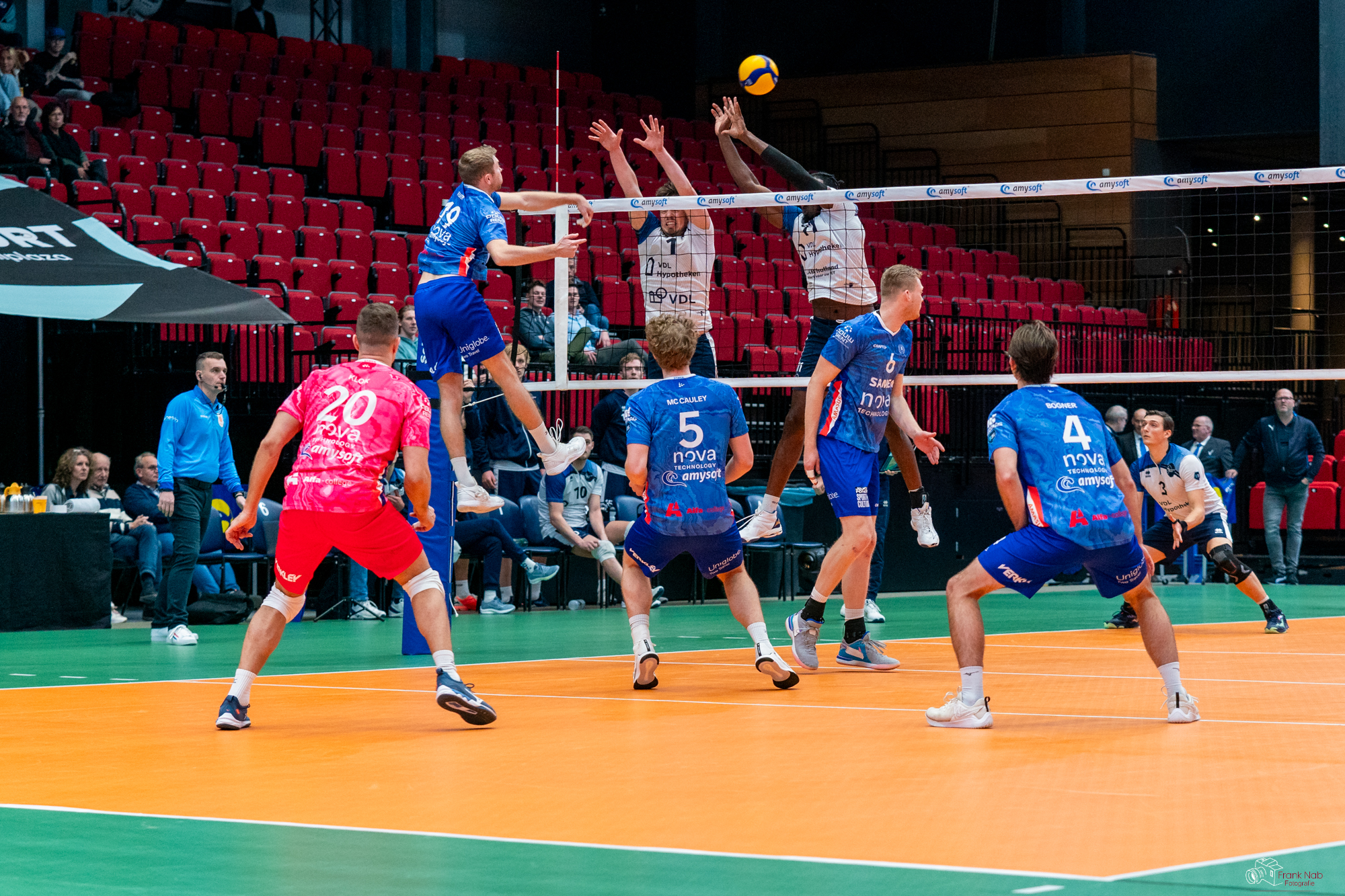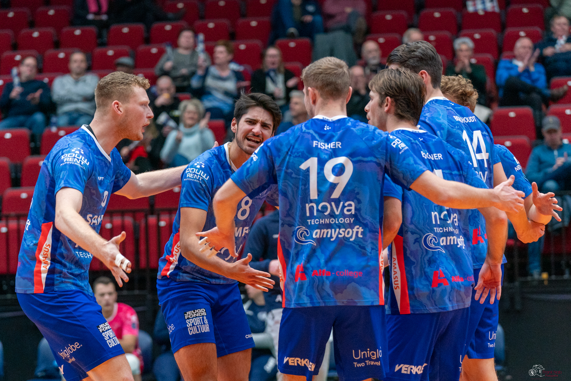 De overtuiging en energie ontbrak voor zo’n vijfhonderd toeschouwers bij de thuisploeg in de fases dat het er echt om ging. Zo was het begin van de vierde set bij een 2-1 voorsprong in sets moeizaam met een 4-0 achterstand. Vervolgens lukte het om langszij te komen bij 13-13 en ging het tot 21-21 gelijk op waarna het toch de gasten waren die er een vijfde set uit sleepten. Het lukte de thuisploeg in die fase niet om het initiatief te pakken en door te drukken om de volle winst in Groningen te houden. En in de vijfde set was het net andersom. Een prima start met een 3-0 voorsprong verdween even snel weer. Na 8-8 was het achter de feiten aanlopen en was de foutserve van Cal Fisher op matchpoint tegen een voorbeeld van er niet met overtuiging staan. Bekijk hier de statistieken.